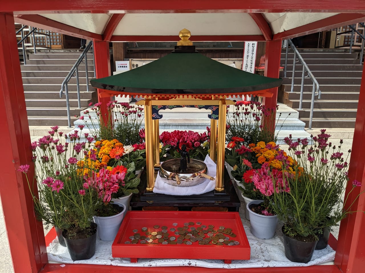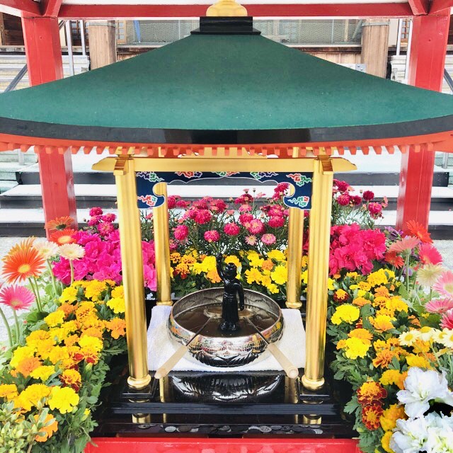 ◎花まつり 4月8日はお釈迦様の誕生日🎊 本堂前に花御堂をご用意いたしました。 誕生仏は聖地ブッダガヤのもの。花御堂は寺族の手作り。そして、装飾の折り紙のお花は寺カフェの常連のさきえさん作のものです🌸 今年はパステルカラーでまとめてくださいました✨ お釈迦様。