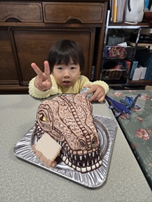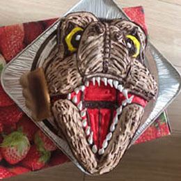大好きな恐竜ケーキで 孫も大喜びでした& 8252;& 65038; 恐竜、ティラノサウルスの顔型立体ケーキ- 最短3日で美味しい生ケーキ をお届け!キャラクターケーキ通販のキャラケーキ.com。