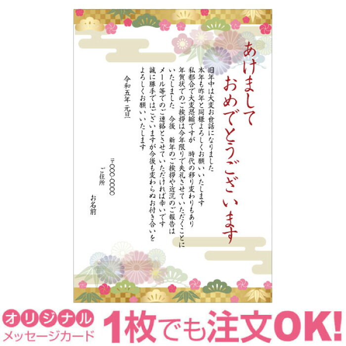 楽天市場あなたのあいさつ文を入れて1枚から印刷OK 終活年賀状 終活 オリジナル 最後の年賀状 デザインカード 年賀はがき 最後の挨拶 終い挨拶年賀状じまい 年賀状辞退 差出人印刷有 2023年 令和五年 : 写真deメッセージカードショップ。