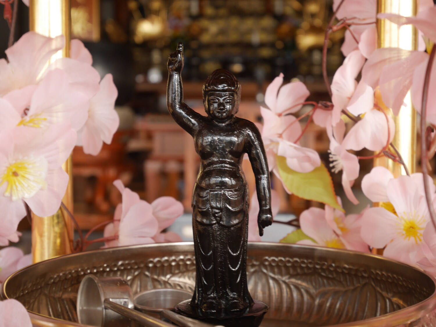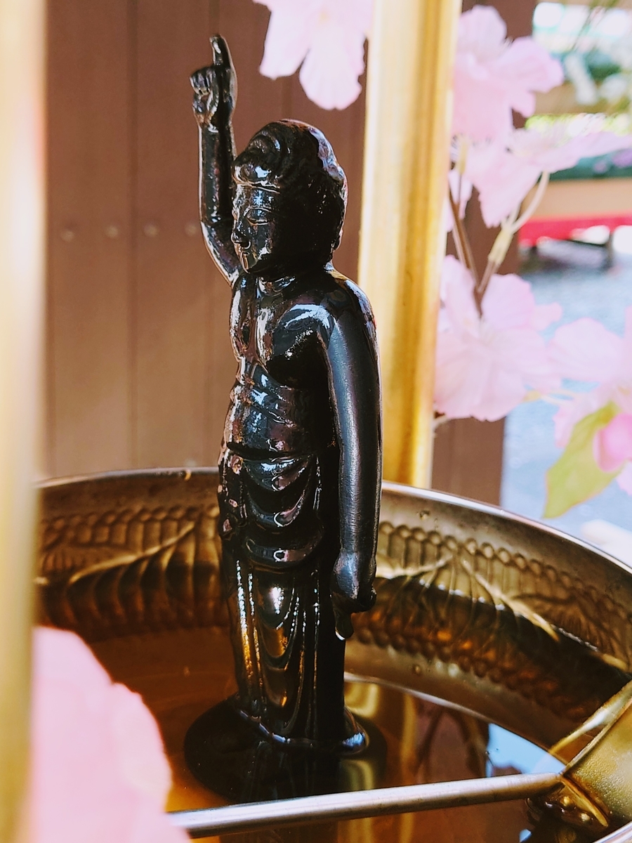 お釈迦様の誕生日『花まつり』お釈迦様が生まれた時の姿をした「誕生仏」に甘茶かけてお参り。