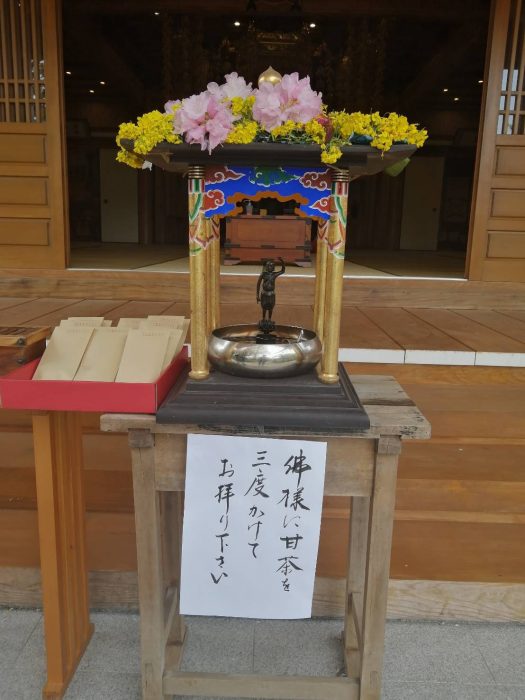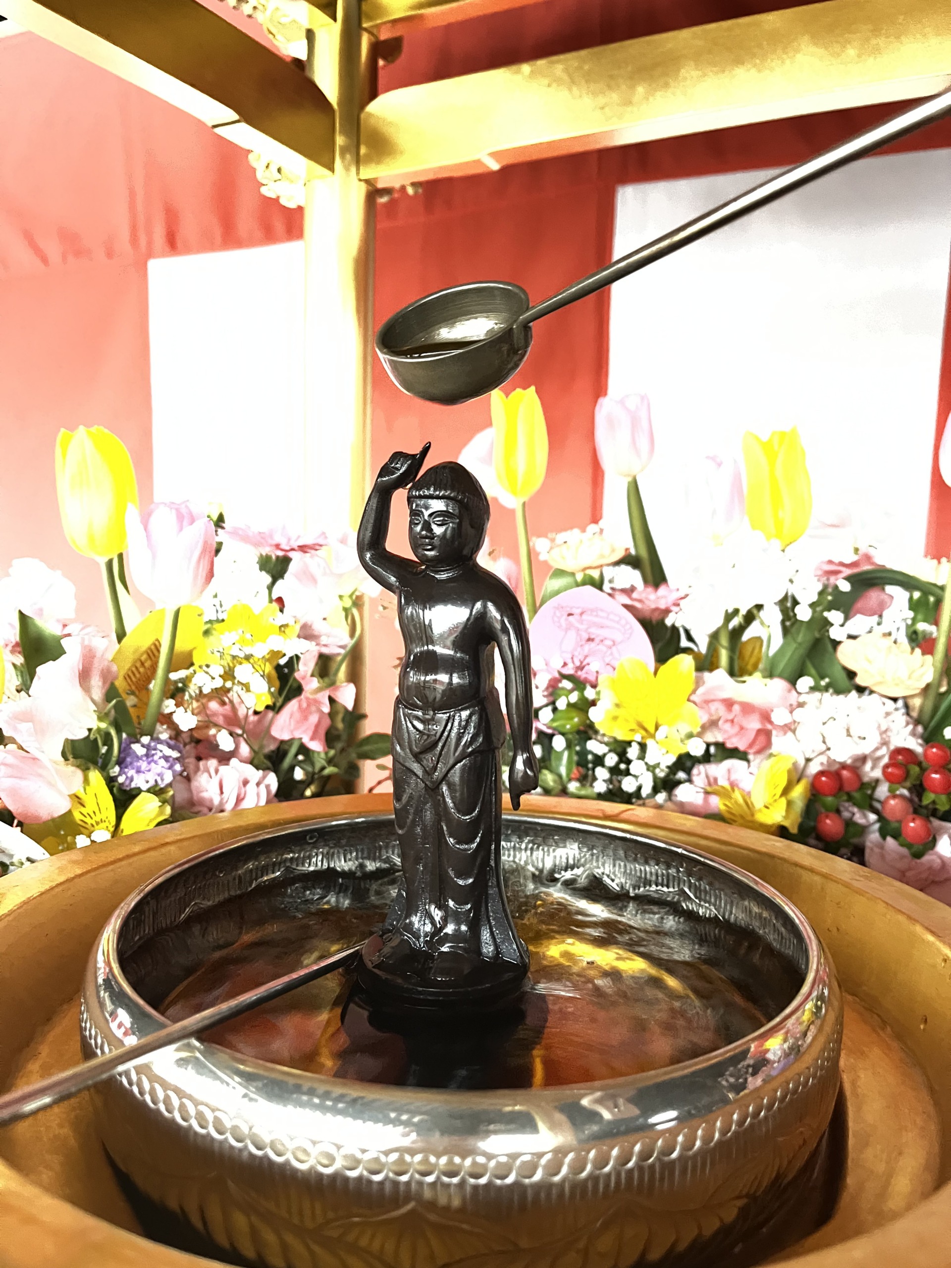 きょう「花まつり」お釈迦様の誕生祝って甘茶かけ。