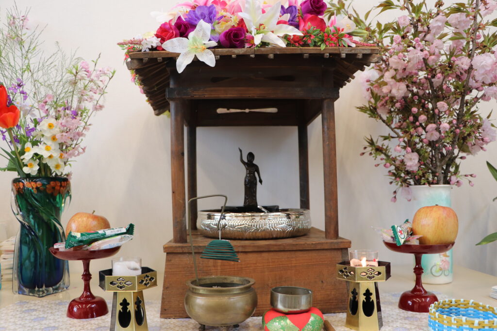 Gotan-e降誕会, 2023.4.8,4月8日はお釈迦様のお誕生日です。この日、当山では様々な草花で飾った花御堂 はなみどう を本堂西側に設置して読経を行い、お釈迦様の像に甘茶をかけてお祝いいたします。