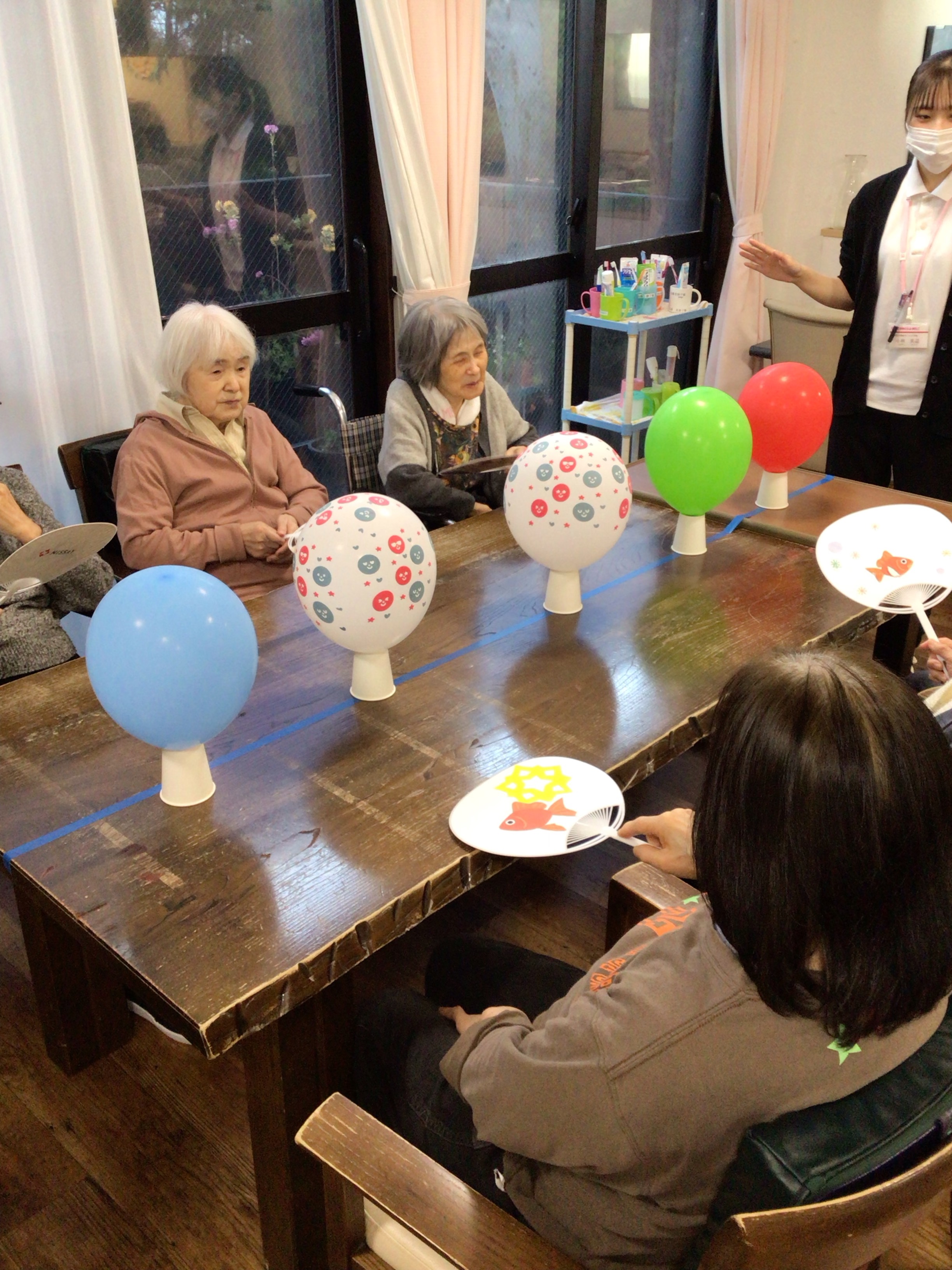 うちわで風船入れ❕すずらん便り笑顔の咲く家 すずらん - 愛媛県の小規模多機能型居宅介護・老人ホーム・サ高住・デイサービス。