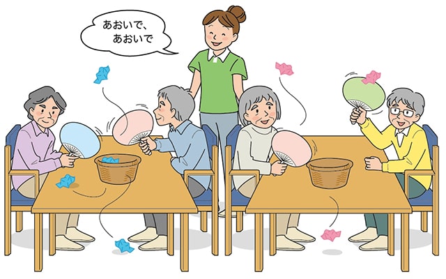 うちわをあおいで「パタパタちょうちょう」高齢者介護をサポートするレクリエーション情報誌『レクリエ』。