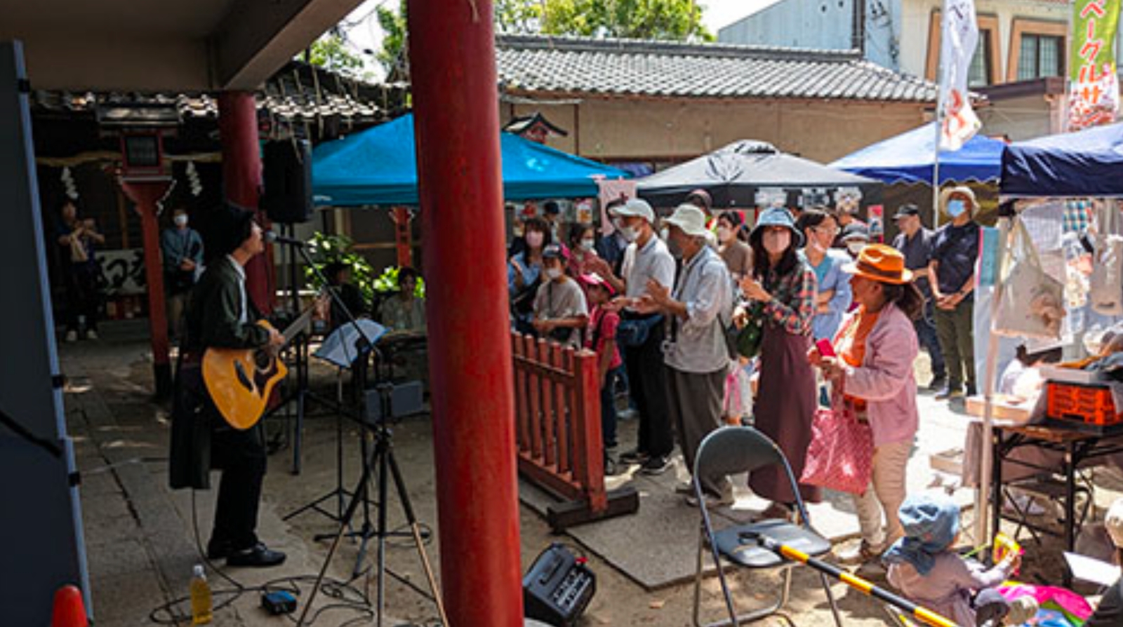 瓢箪山稲荷神社の夏祭り今日と明日瓢箪山稲荷神社では、夏祭りが行われています。境内では、シンガーソングライターの若林美樹さんによるLIVEが行われたり、河内音頭をみんなで踊ったりされていました。また、参道には多くの露店が並び、平日にも関わらず、多くの人。