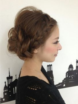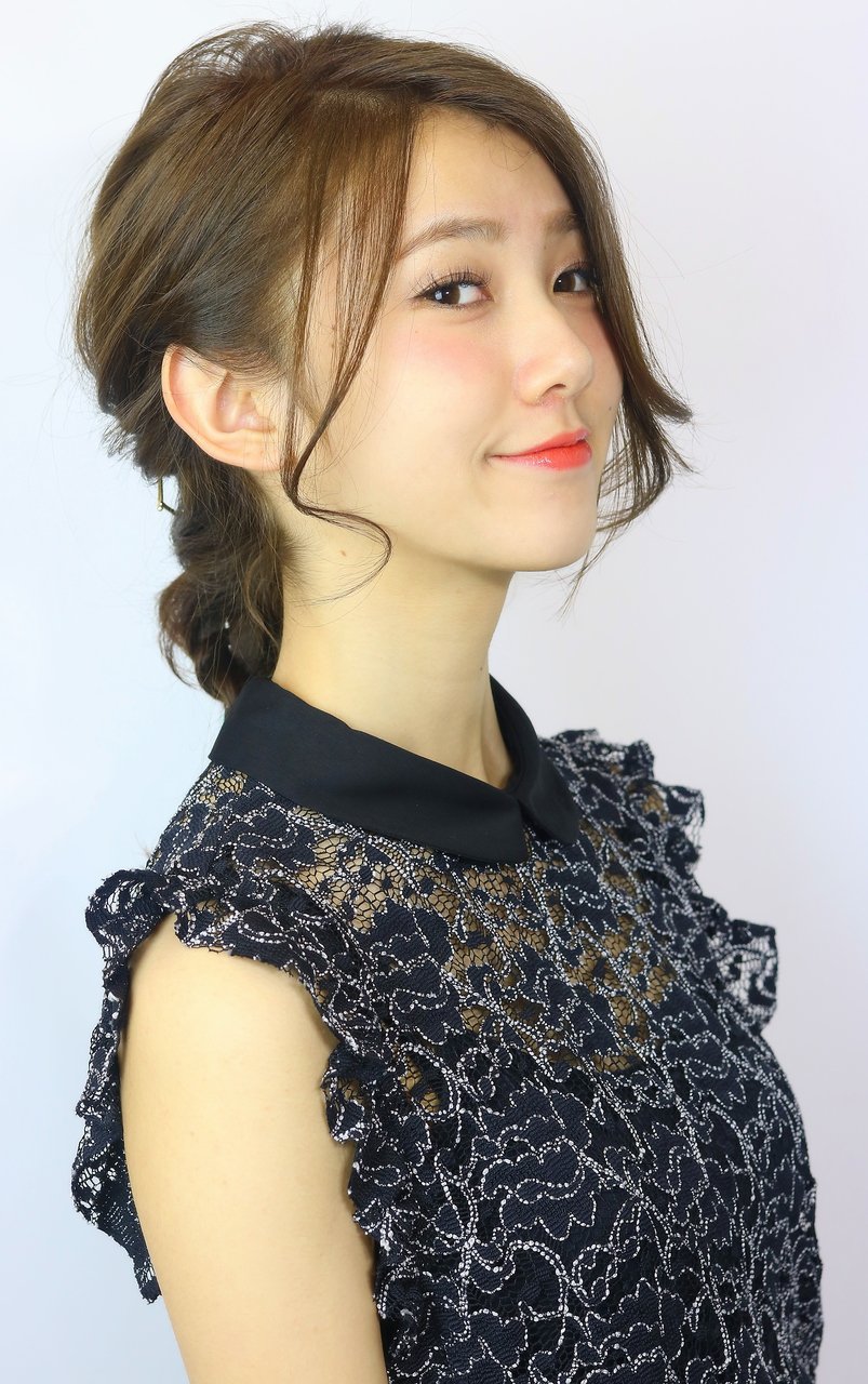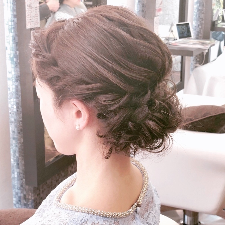 お呼ばれヘアセット 大人なきまりすぎないシニヨンアップスタイル丸型×ミディアムの20代-30代におすすめ 前髪 ぱっつん×みつあみ×黒髪 ブラック モテ・愛されヘアスタイル- OZmallヘアサロン予約。