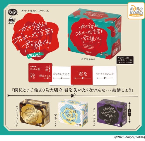 ClaGlaによるボードゲーム『たった今考えたプロポーズの言葉を君に捧ぐよ。』がミニサイズになってカプセルトイに登場!アイピーフォー株式会社のプレスリリース。
