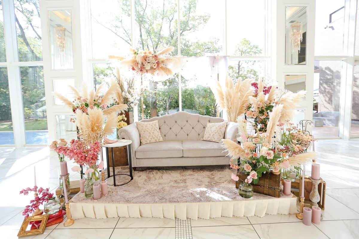マイレポ花嫁さんから見つけた♡オシャレすぎる 高砂ソファ 装花12選ウェディングニュース。