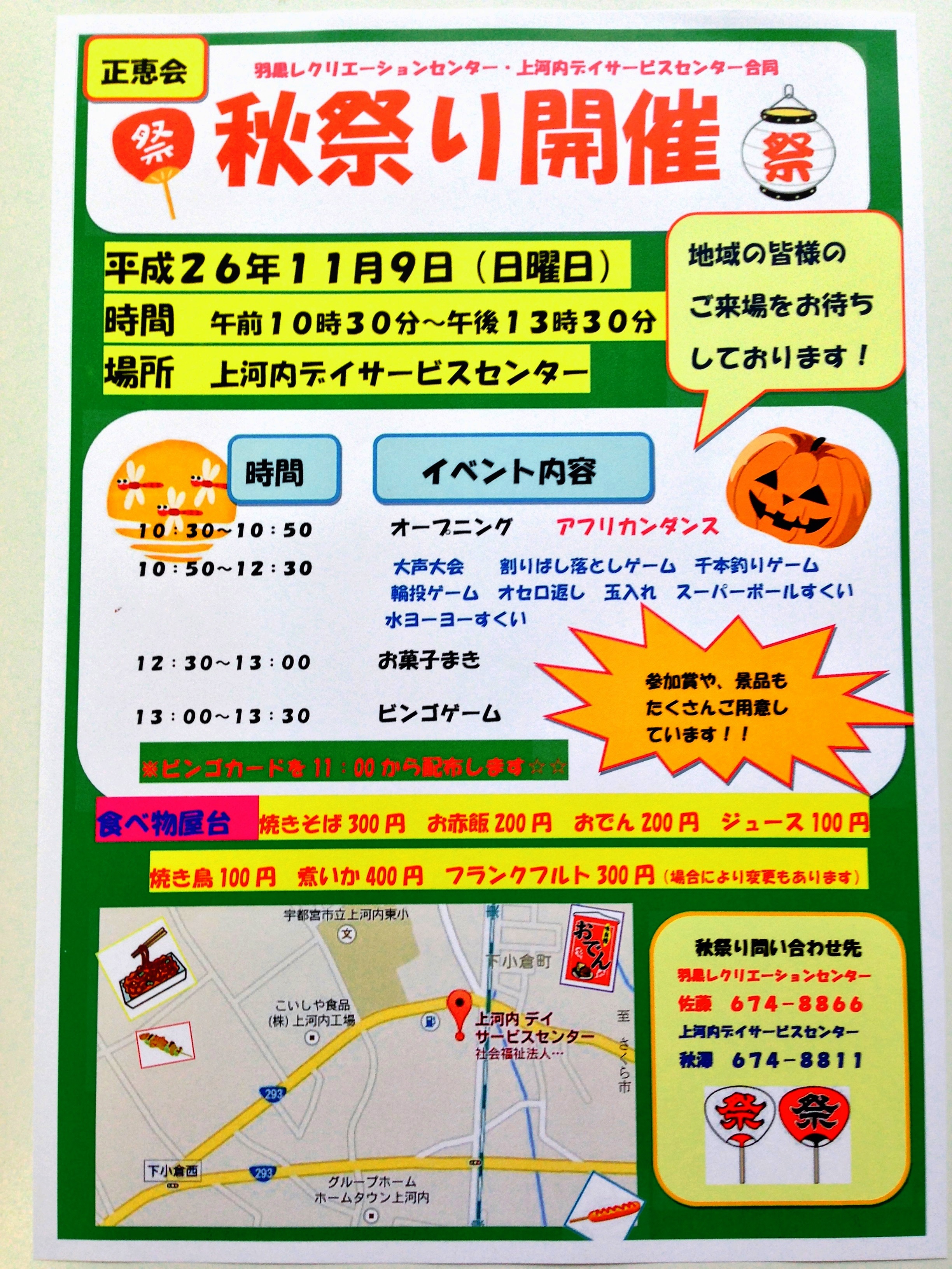 ふるまい ウエルネス 秋祭りのお知らせイベントお知らせ生活サポーターふるまい-介護・デイサービス・看護。