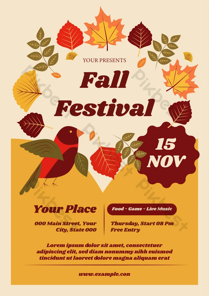 落ち葉フレームの秋祭りチラシテンプレートの無料チラシテンプレート 14746 - デザインAC。