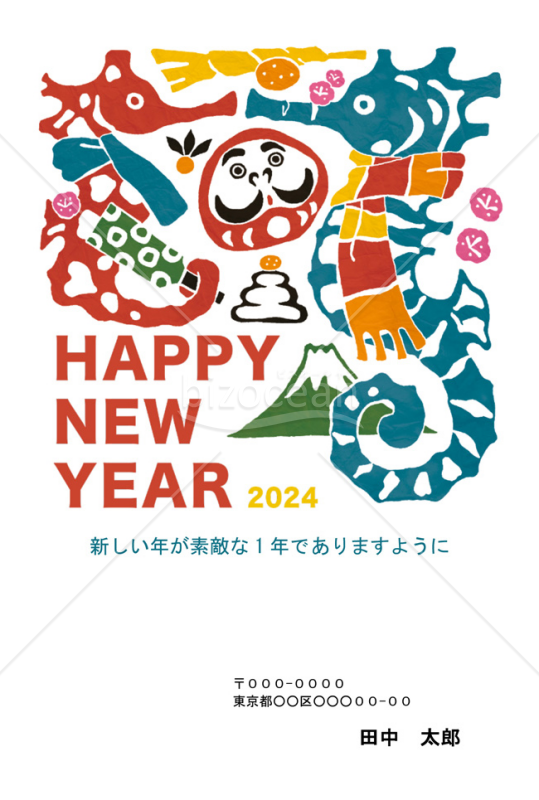 2024年 タツノオトシゴの親子にさまざまな縁起物をあしらった和風年賀状bizocean ビズオーシャン。