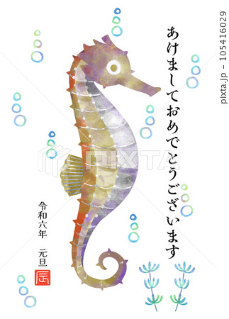 2024年辰年年賀状デザイン 縦水彩タッチのタツノオトシゴのイラストのイラスト素材105416029- PIXTA。