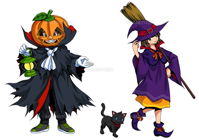 ハロウィン仮装 ジャック&魔女と黒猫10456000155 の写真・イラスト素材アマナイメージズ。