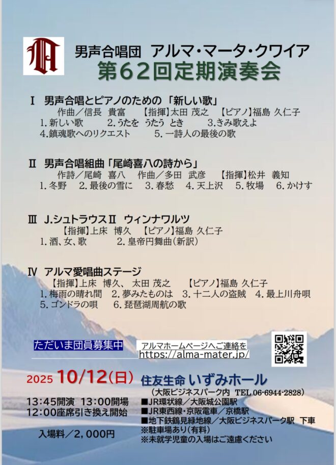 アルマ・マータ・クワイア – 男声合唱団アルマ・マータ・クワイア大阪を拠点とする一般男声合唱団です。