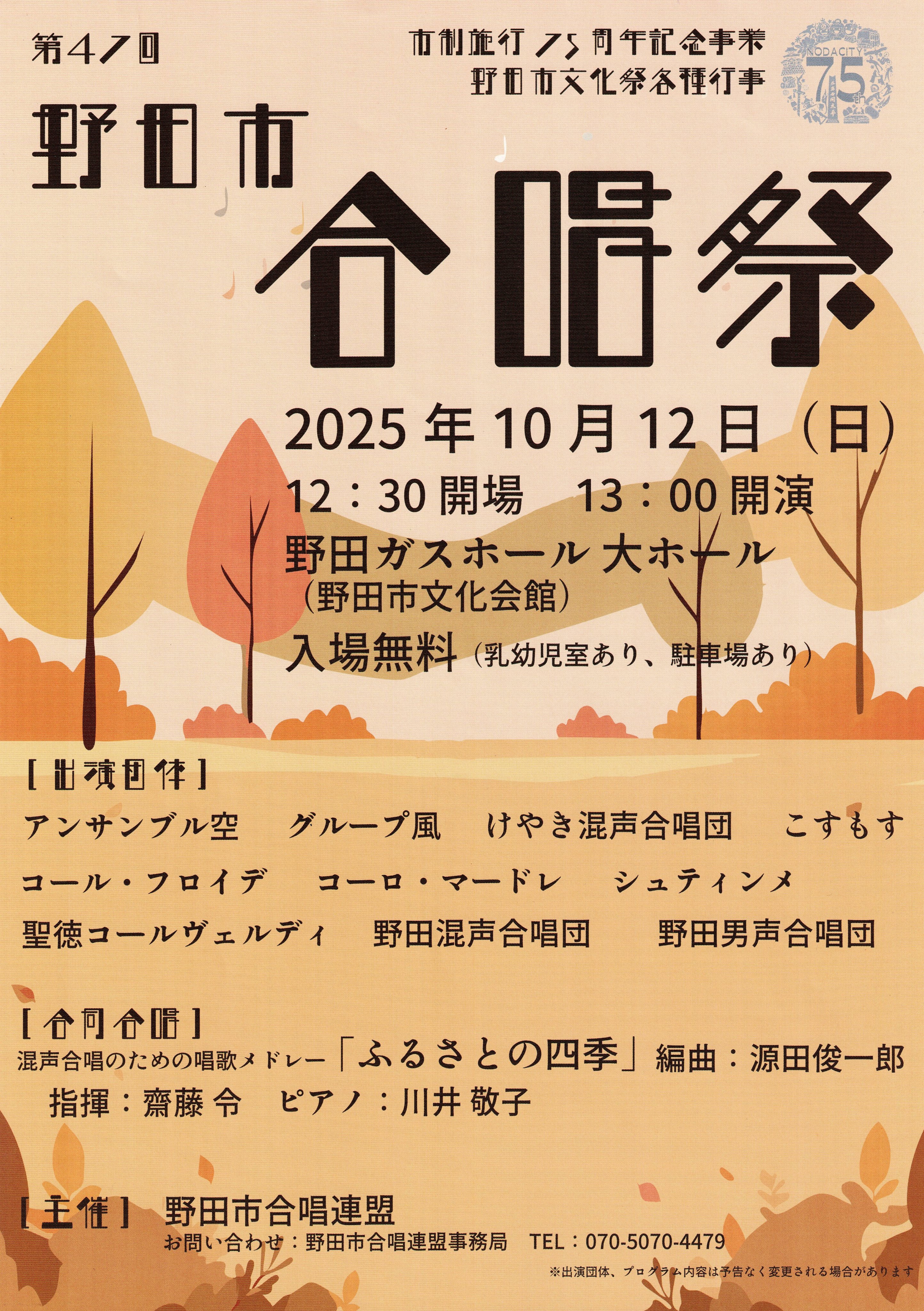 齋藤 令TSUKASA SAITO on X: "☆野田男声合唱団 ピアノ:名倉扶季さん といっしょに①小関裕而 香取佳津見:詩,齋藤令:編野田市歌 男声合唱版②多田武彦 北原白秋:詩『柳河風俗詩』より かきつばた ③同上組曲より 梅雨 の晴れ間 https:t.co TrjU1ZoAYp"X。
