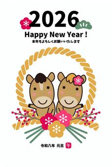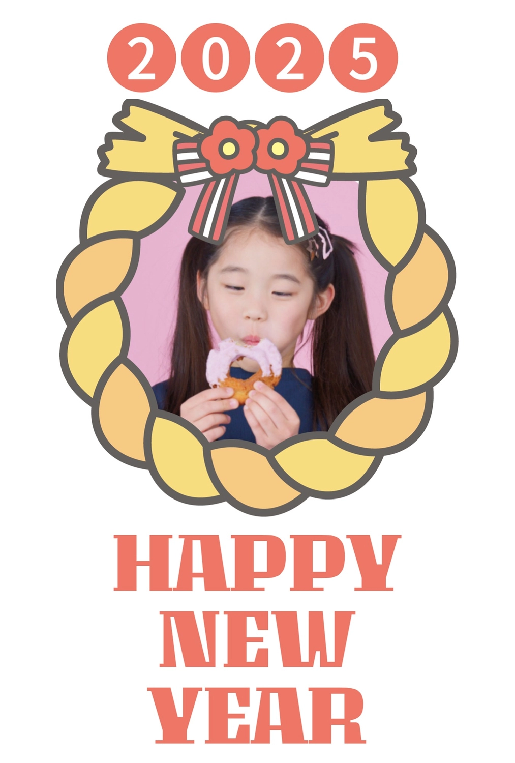 2025年 令和7年 の年賀状テンプレート・英語表記・干支の白いへびと梅の花、しめ縄のか イラストボックス「プレミアム」テンプレート。