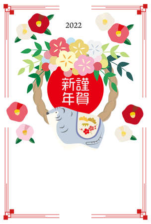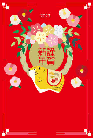 椿の花と虎の置物としめ縄の年賀状イラスト。日本語の文字は「明けましておめでとうございます。今年もよろしくお願いします。」英語で。のイラスト素材・ベクターImage 173870772。