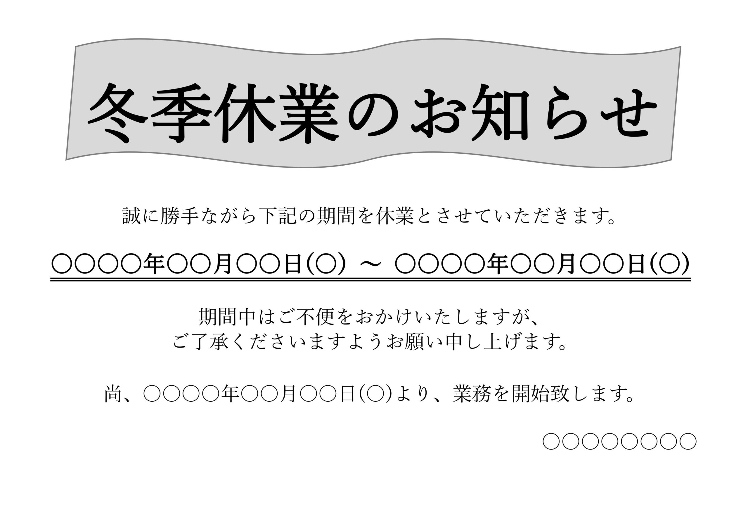 冬季休業のお知らせ・張り紙 夏季休業・GW・長期休業 Excel・Wordで例文のサンプル。