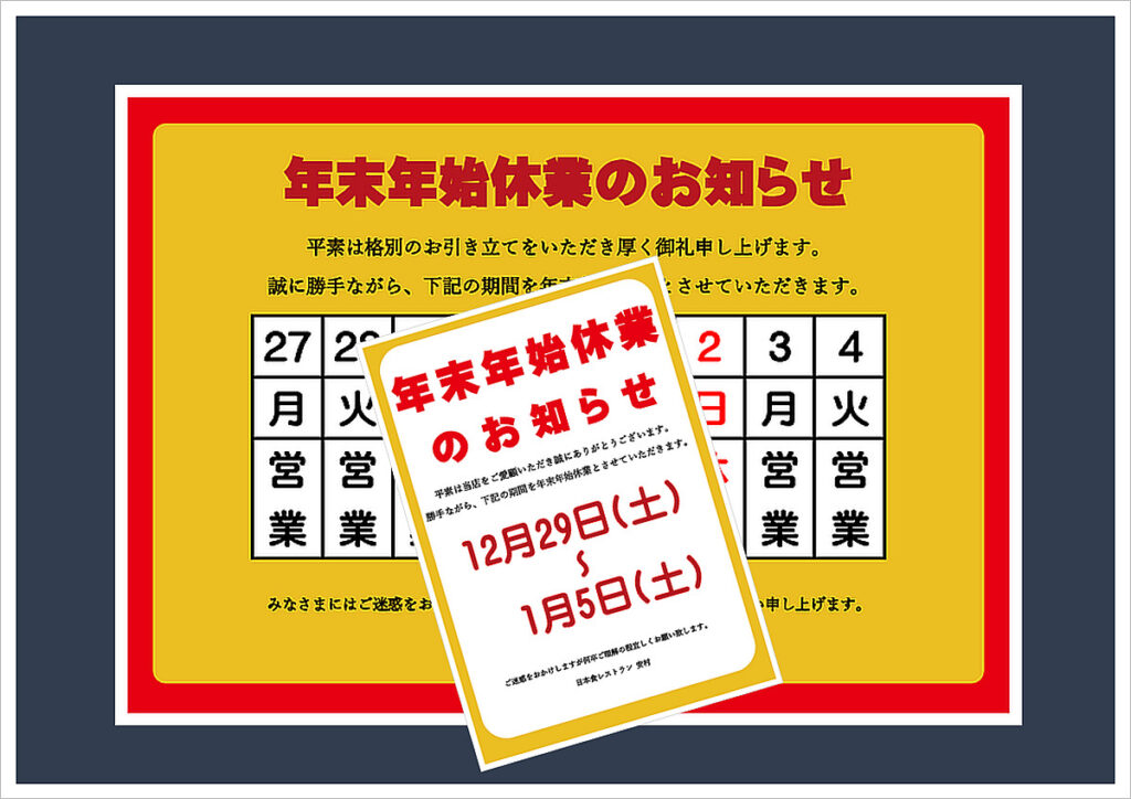 会社や店舗の営業・年末年始休業のお知らせ張り紙のテンプレートをダウンロード「エクセル・PDF」:イラスト無料。