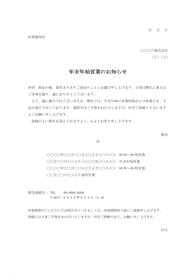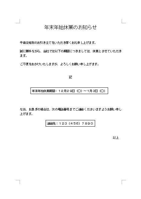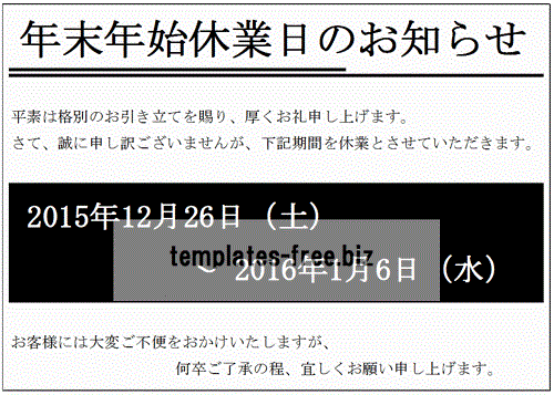 年末年始営業の案内状・張り紙・お知らせ 例文・見本 Wordで簡単にテキスト編集が出来るビジネス文章無料テンプレートTemplateBox。
