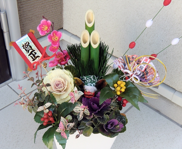 新年の寄せ植え 正月飾り 葉牡丹・カラー・ポットマム。