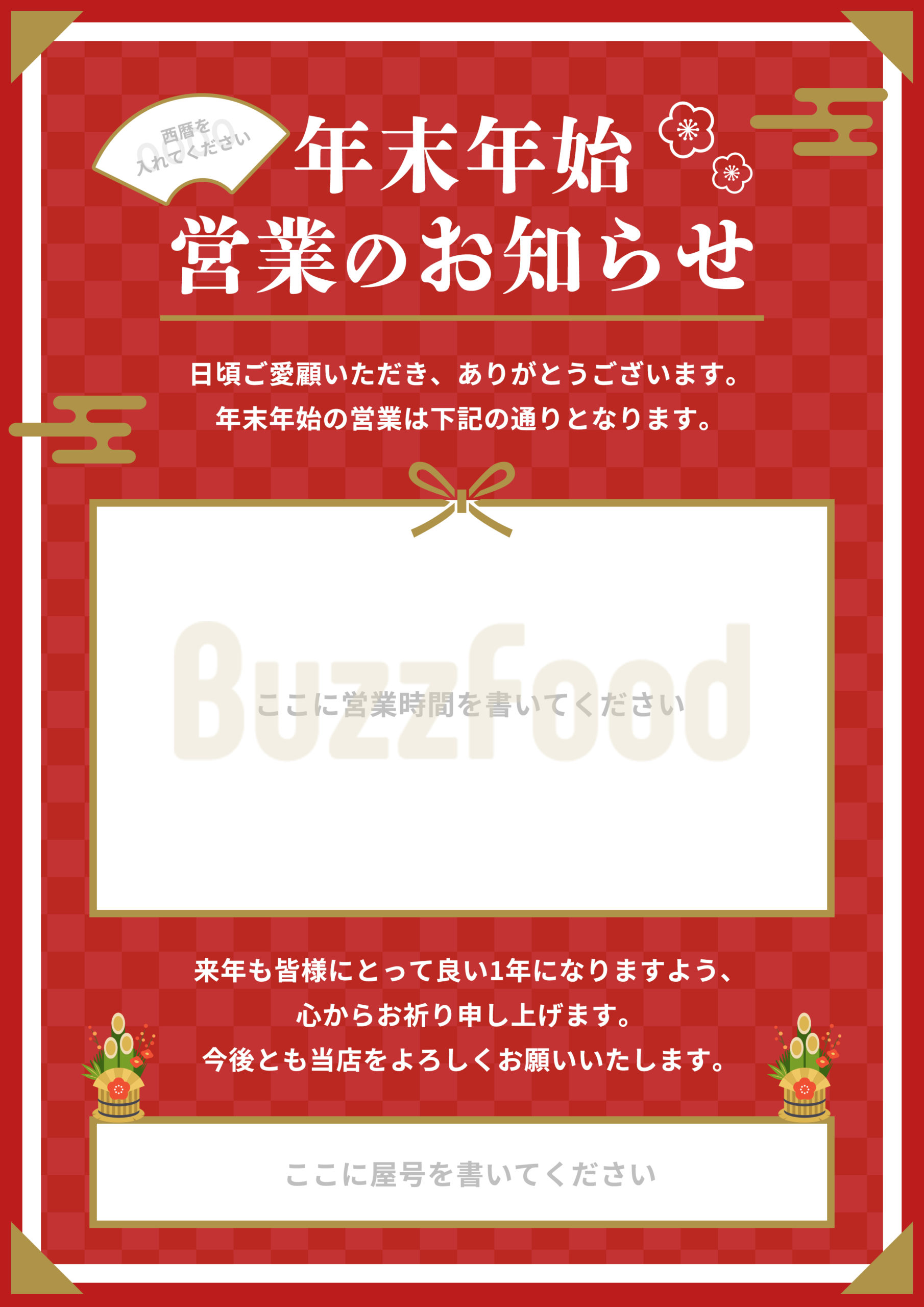 年末年始のお知らせ・告知ポップ 完全書き込みタイプあいさつ文あり カラー:赤・白 縦レイアウト - BuzzFood。