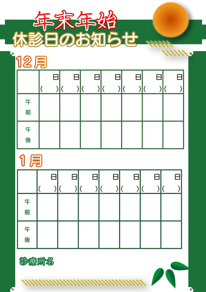 張り紙・お知らせのテンプレート「年末年始のご案内」お正月の休診日や休業日、診療日や営業日 イラストボックス「プレミアム」テンプレート。