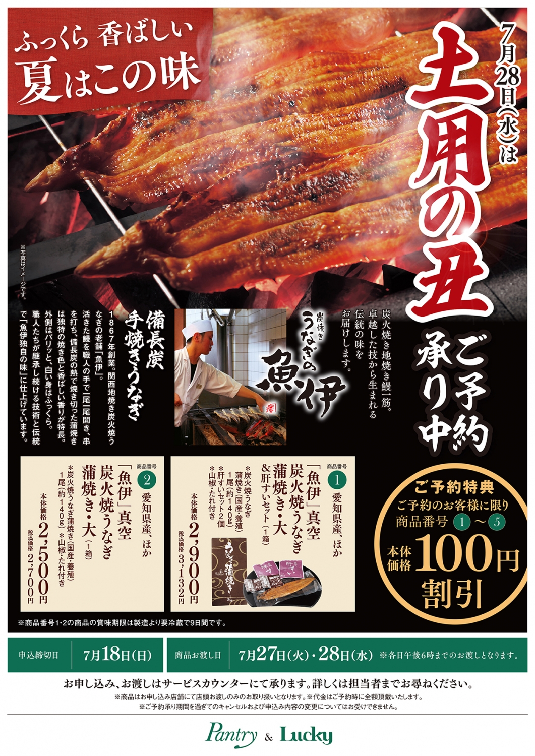 受付終了しました! 土用の丑 ご予約承り中です♪キャンペーン・お知らせ食は愛 Pantry&Lucky パントリー&ラッキー株式会社大近。