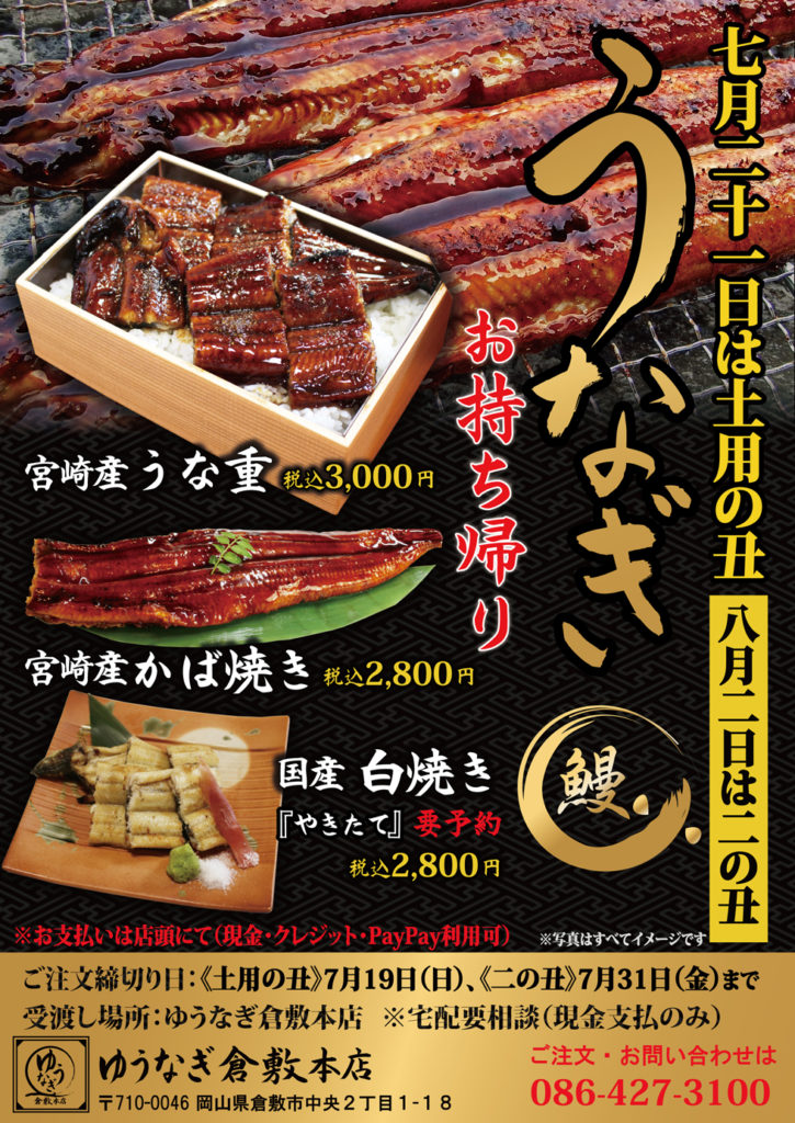 土用の丑の日!『うなぎ』ご注文承り中!! - お知らせゆうなぎ倉敷本店。