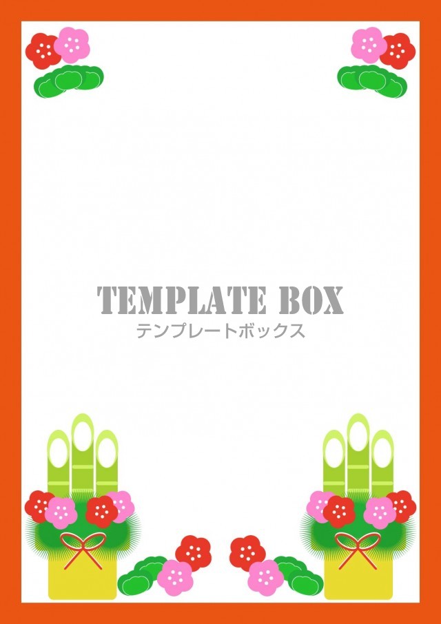 1月のイメージのフレーム・枠素材、門松のお正月飾りと紅白の梅の花のデザイン無料イラスト素材TemplateBox。
