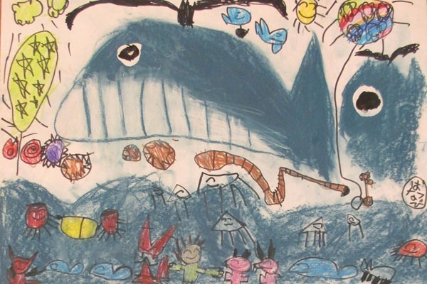 年長 みかん組🍊 絵画「くじら🐳」 4枚目の絵画は絵本『うみのおまつりどとんとせ』をテーマに描きました!✨「寝ているクジラ🐳をどうやって起こそうかな?」「何を使ったら起きるかな?」とクジラさんの気持ちを考えながら描く子ども達☺️☺️ とっても可愛い絵画が。