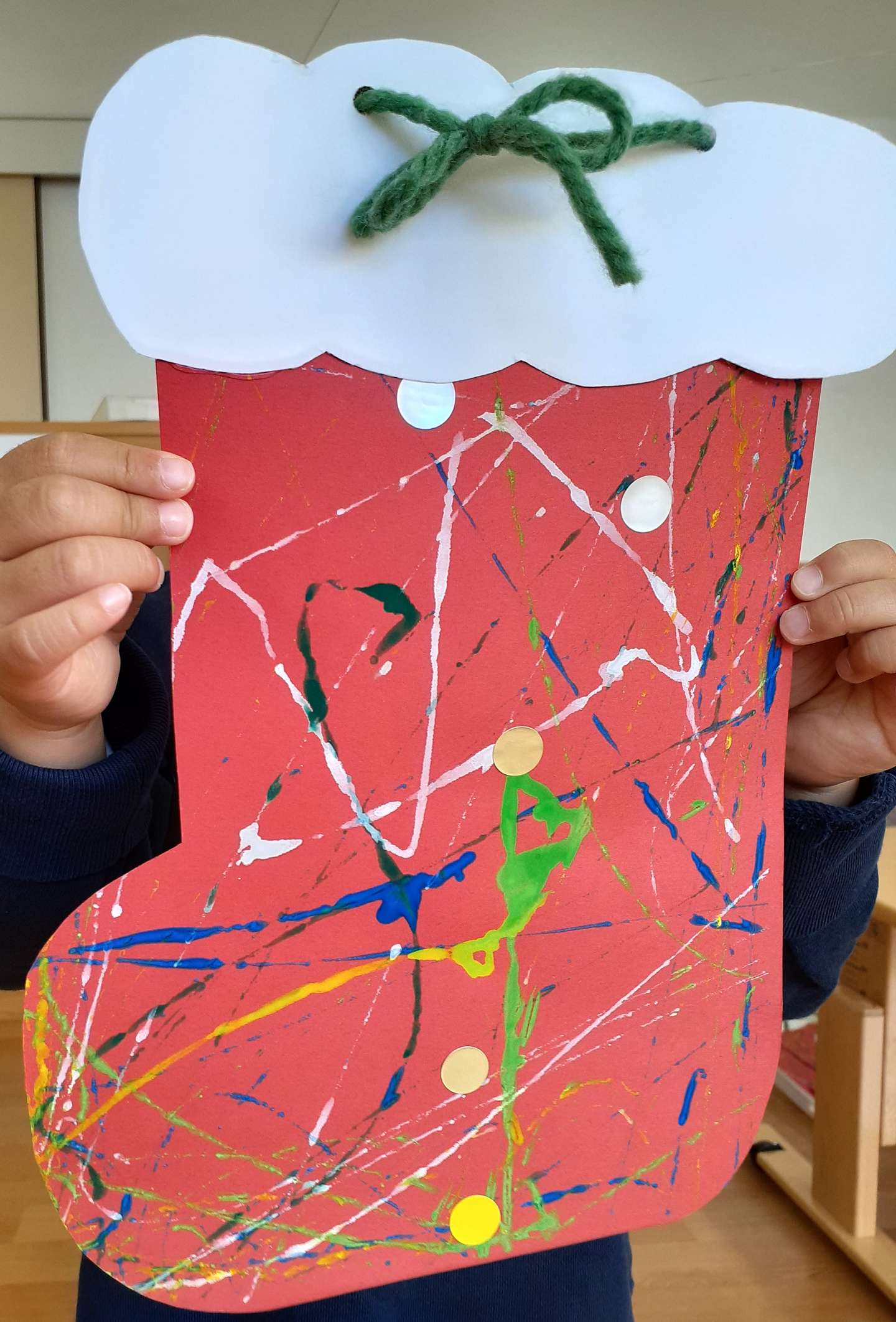 クリスマスブーツの制作 しののめモンテッソーリ子どもの家では、毎年、学年に応じたクリスマスブーツの制作をしています。写真は年中さんのものです。 画用紙の ブーツを縫い合わせて、袋状にしています。表面、裏面共に、子どもが切ったり折ったり三つ編みしたり。年中児。