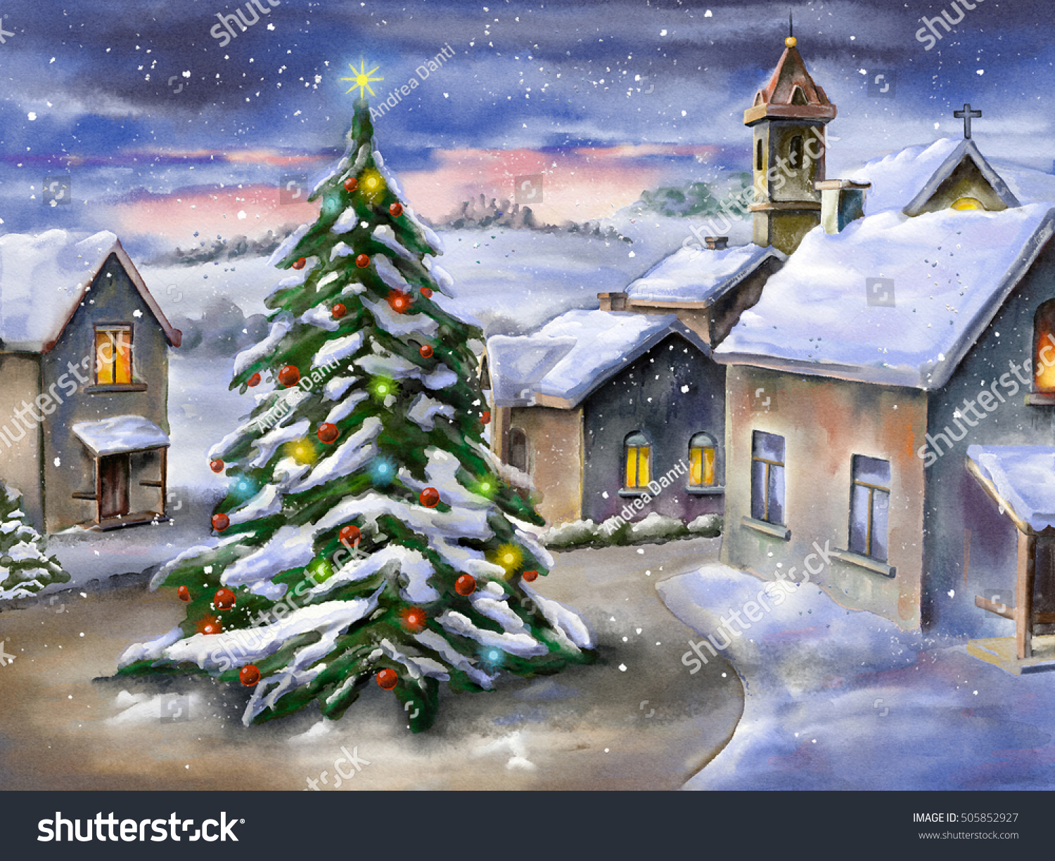 メリークリスマスファンタジーとサンタクロースとクリスマスツリーとプレゼントと街並イラストのイラストイラストレーター検索illustrator e-space。