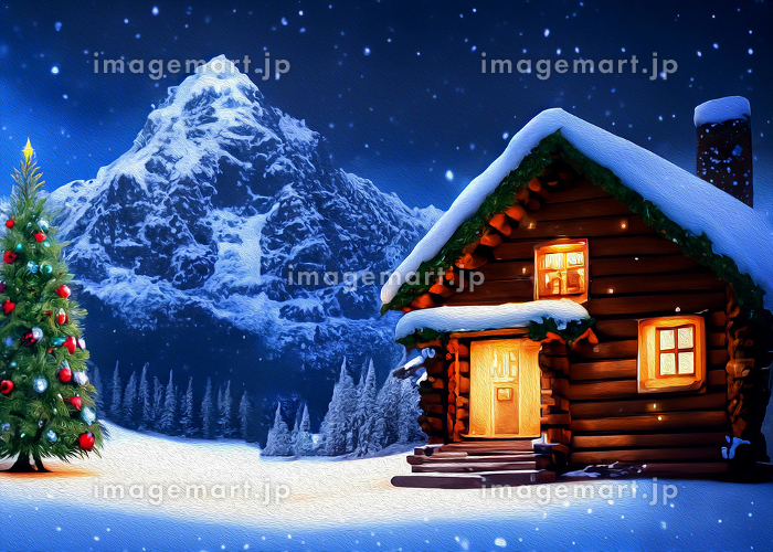 聖夜クリスマスのイメージ風景油彩リアルイラスト 雪山とクリスマスツリーとロッジ AI生成画像236960892- イメージマート。