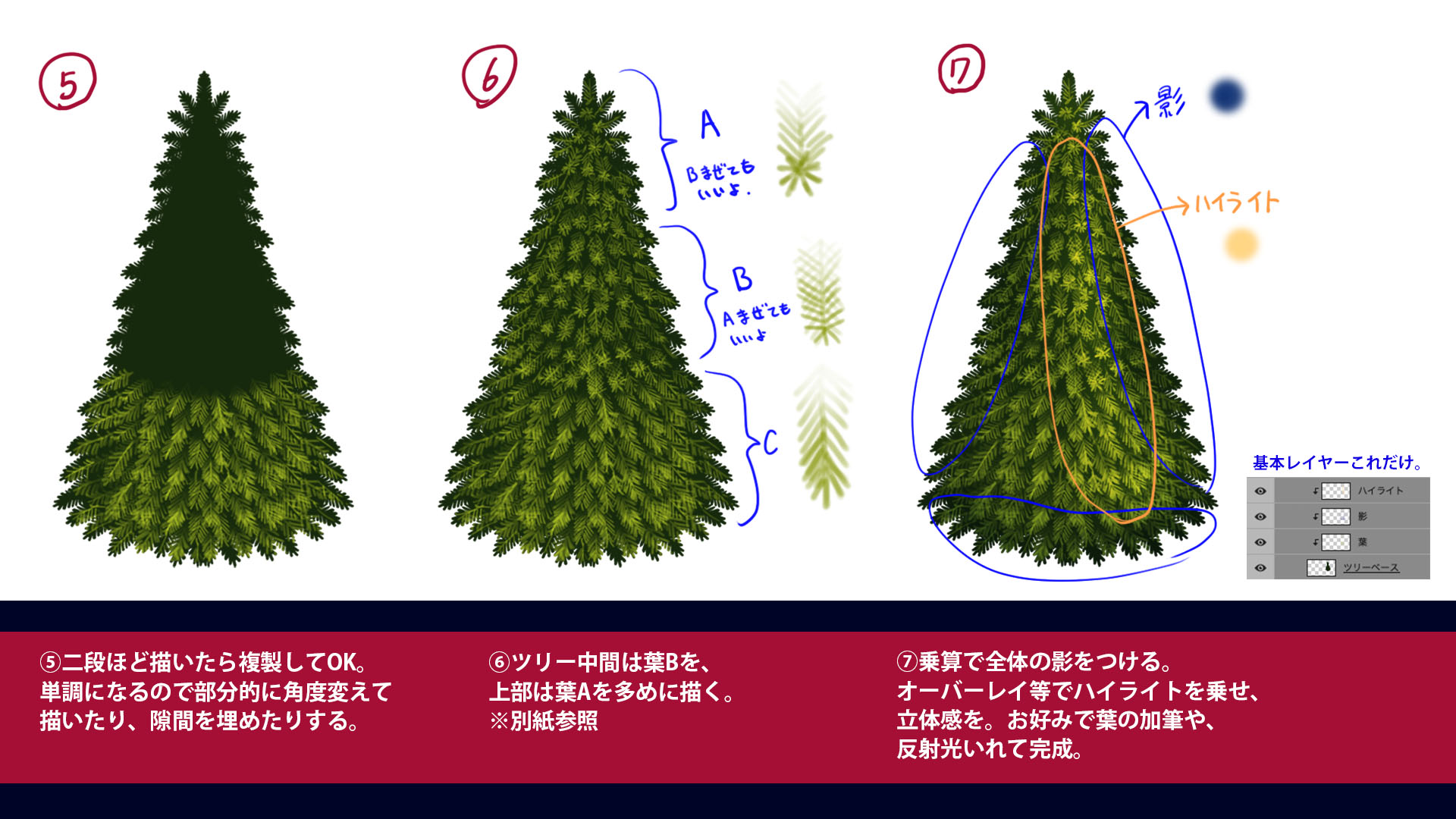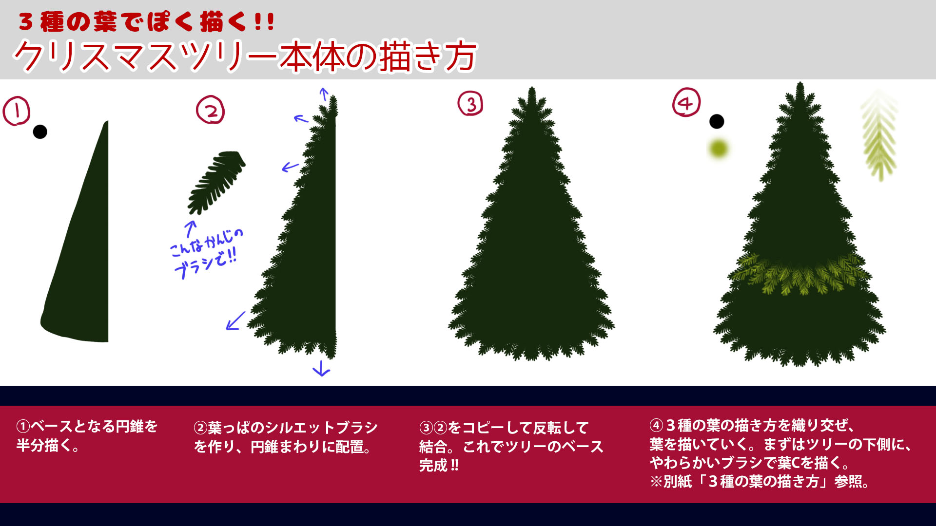 唐揚丸👹🍵Illust&Live2D 動く背景 on X: "自分流楽してぽく描く!!🎄クリスマスツリー本体の描き方🎄リアルめなツリーって描くの大変そうって思いがちですが、 "3種の葉っぱ"を使えば手間少なくぽく描けます !! わりと雑に描いても良い感じに見えるので、 お。