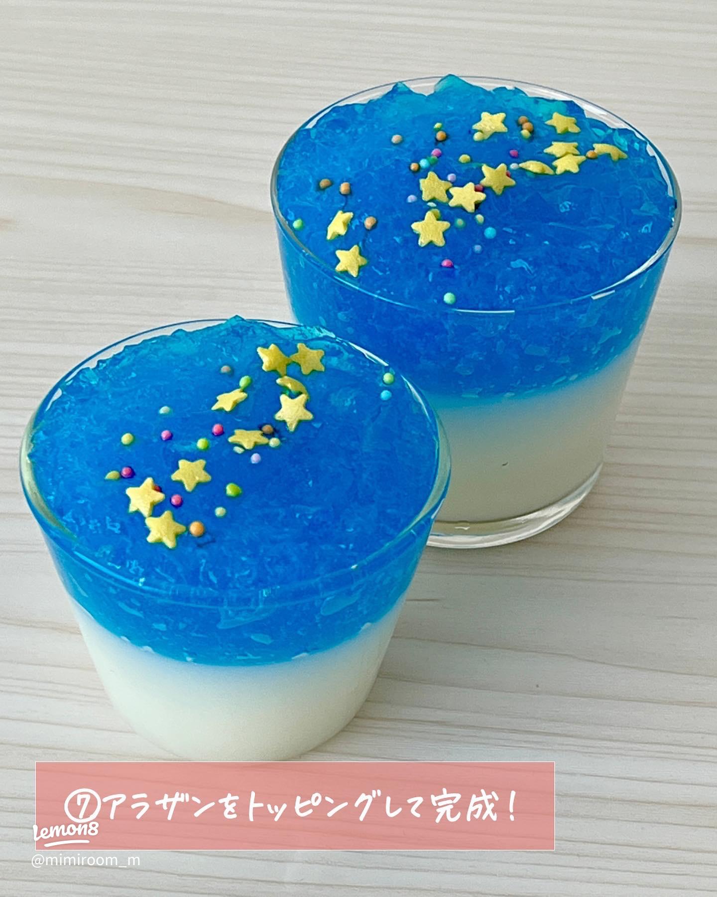 \ぷるぷる簡単!🌟七夕ゼリー🎋 , こんにちは!東海ガススタッフAです!, 今年も七夕ゼリーを作りました!🎋✨,去年より可愛くバージョンアップ!, 簡単ですので是非お試しくださいね😊,材料 6人分, ※砂糖とアガーは粉の状態であらかじめよく混ぜておきます,ミルクプリン , ・牛乳300g, ・水200ml, ・砂糖60g, ・生クリーム30ml, ・アガー1袋 10g ,。