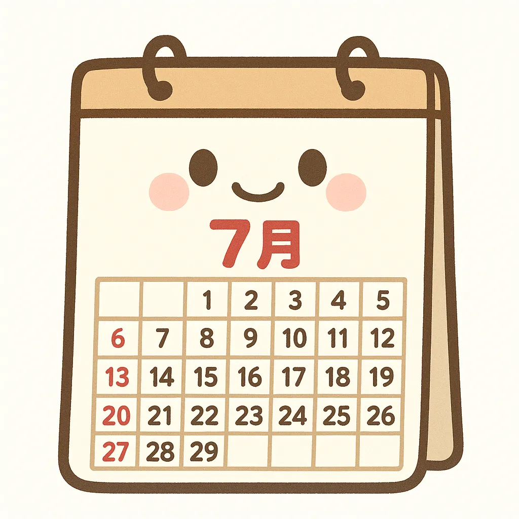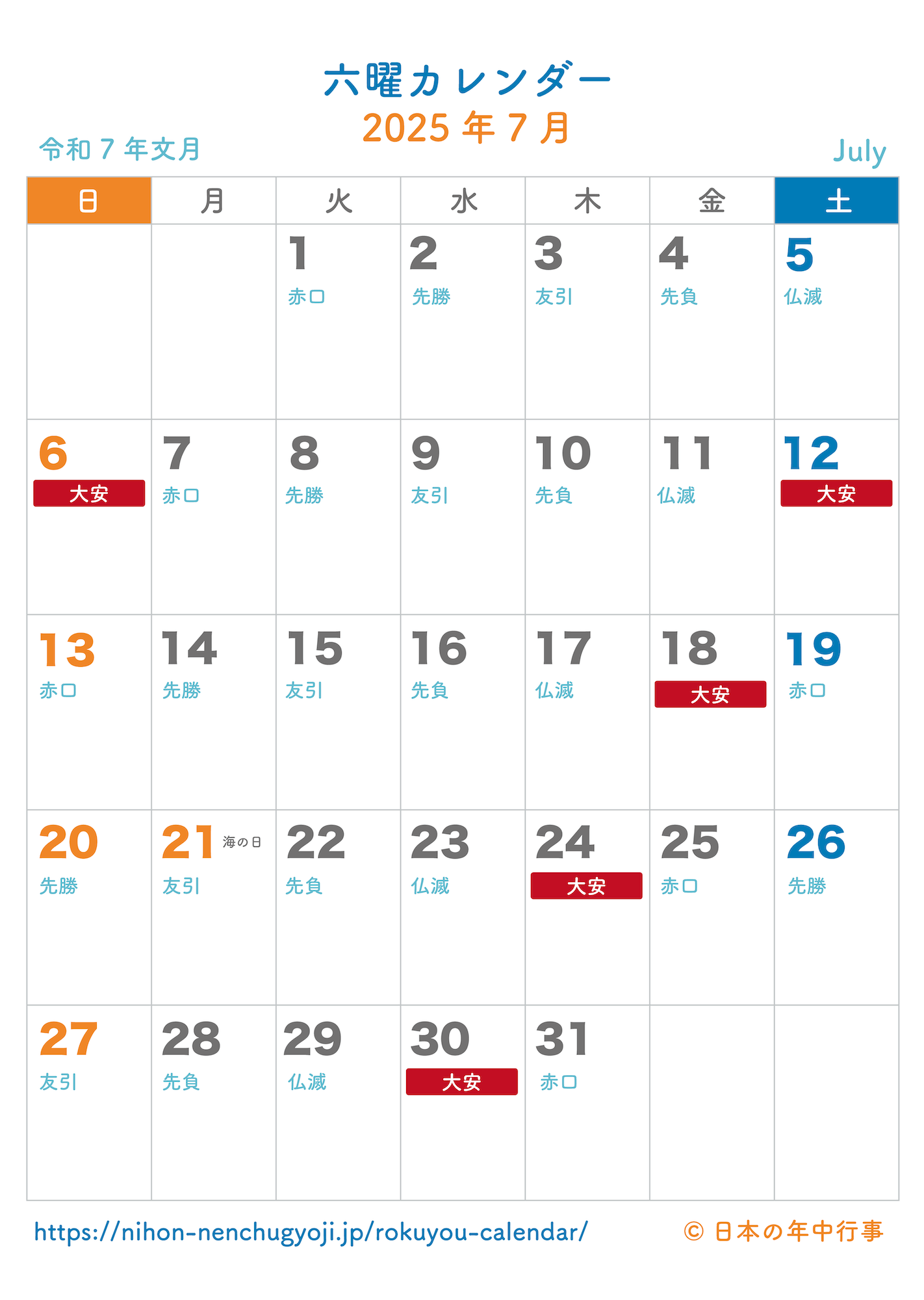 六曜カレンダー 2025年7月 無料ダウンロード&印刷 - 日本の年中行事。