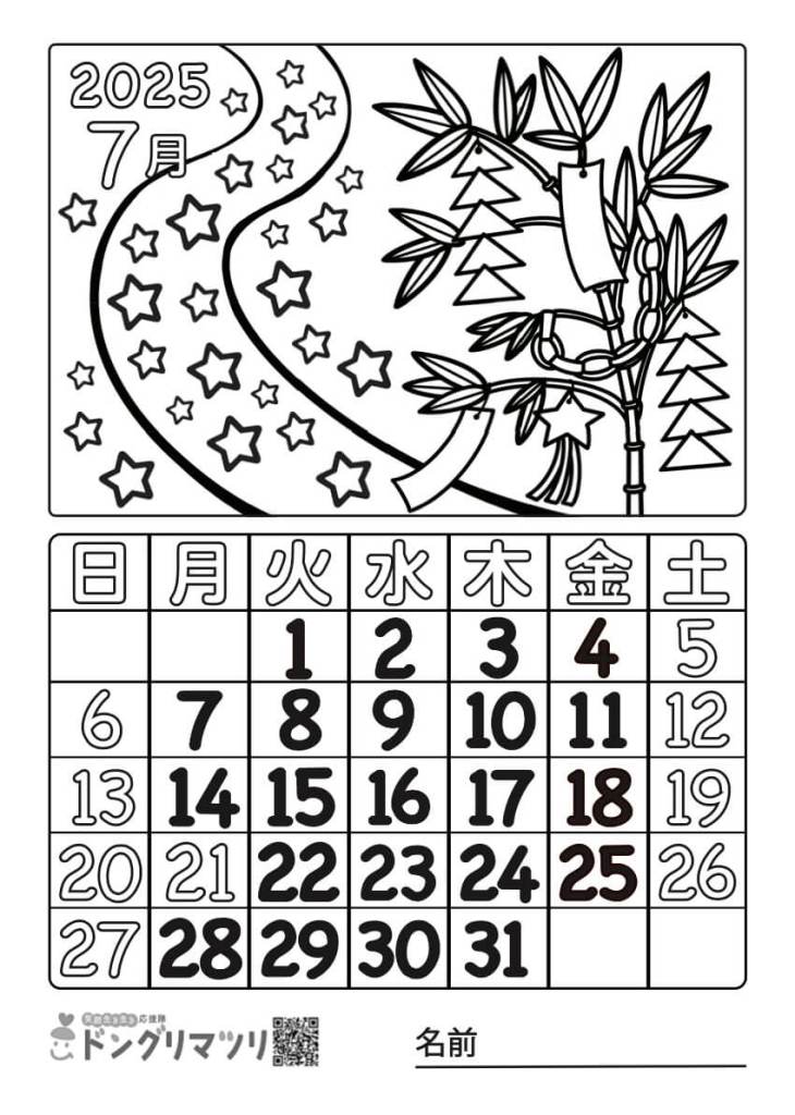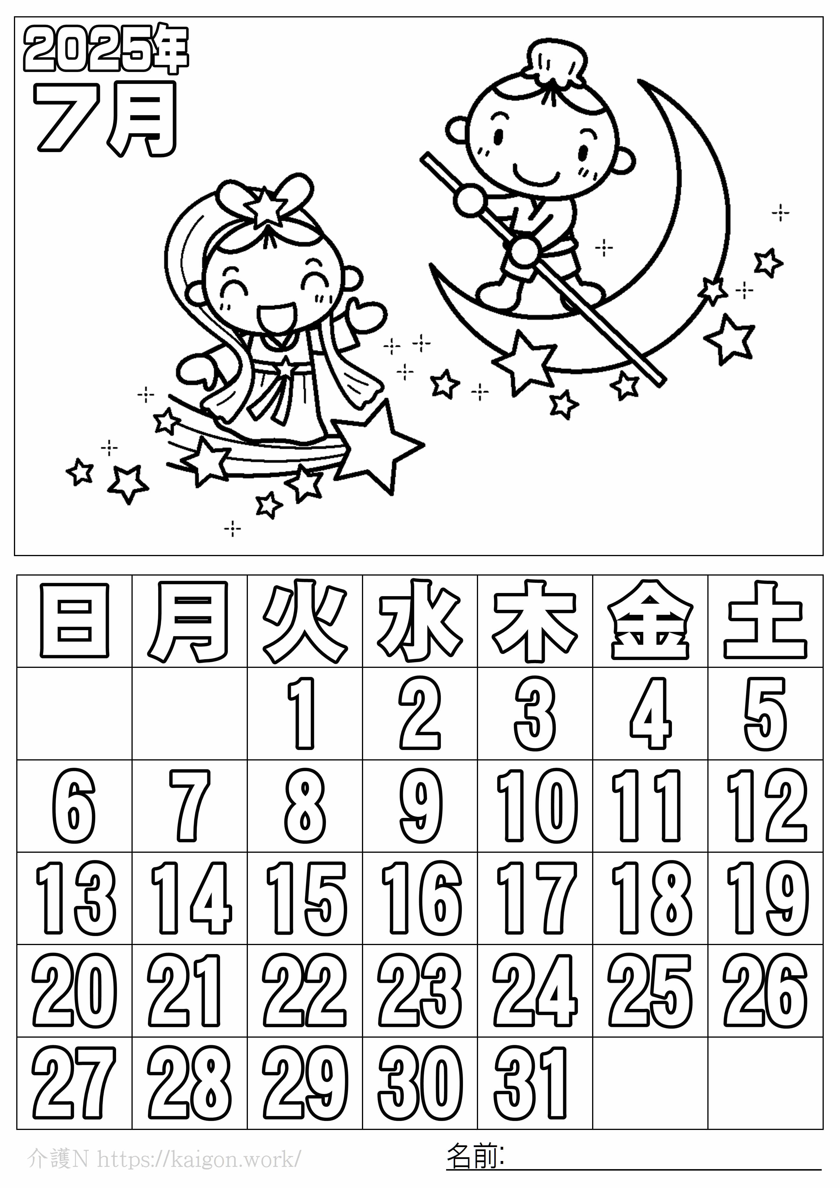 ぬり絵 カレンダー7月 2025年 その1無料 介護N-認知症予防に脳トレ素材。