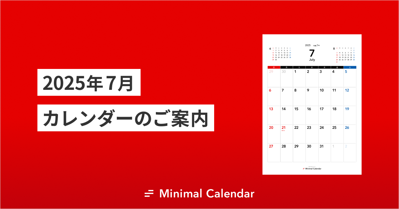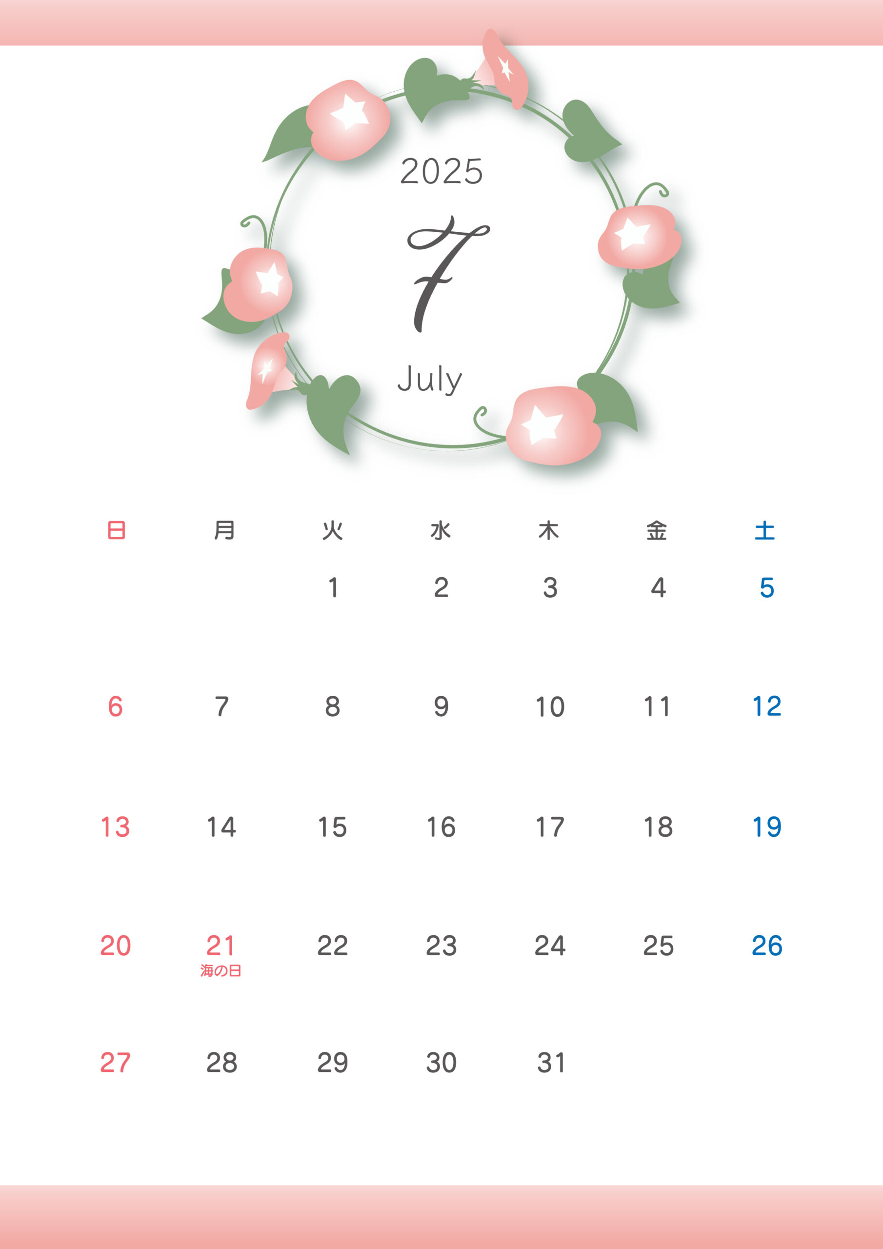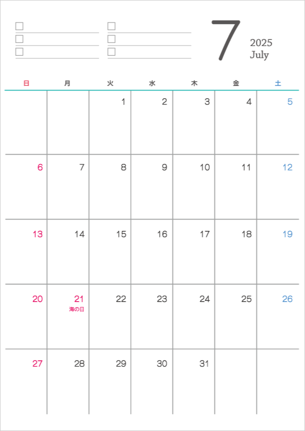 シンプルなデザインの2025年 令和7年 7月のカレンダーイラスト無料・かわいいテンプレート。