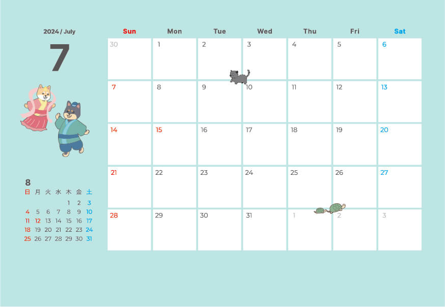 2024年 令和6年 7月のペットカレンダーイラスト無料ペットイラスト Pet-illust 犬・猫・鳥・ペットイラストぬりえ・年賀状・ カレンダーイラスト多数無料。