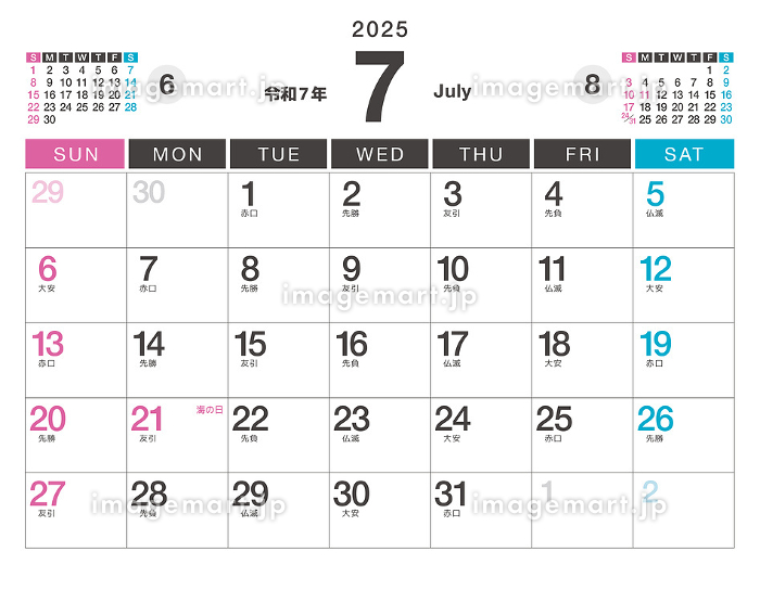 2025年 令和7年 のカレンダー 7月 祝日・六曜 のイラスト素材257135065 毎月1点無料 フリー のストックフォト イメージマート。