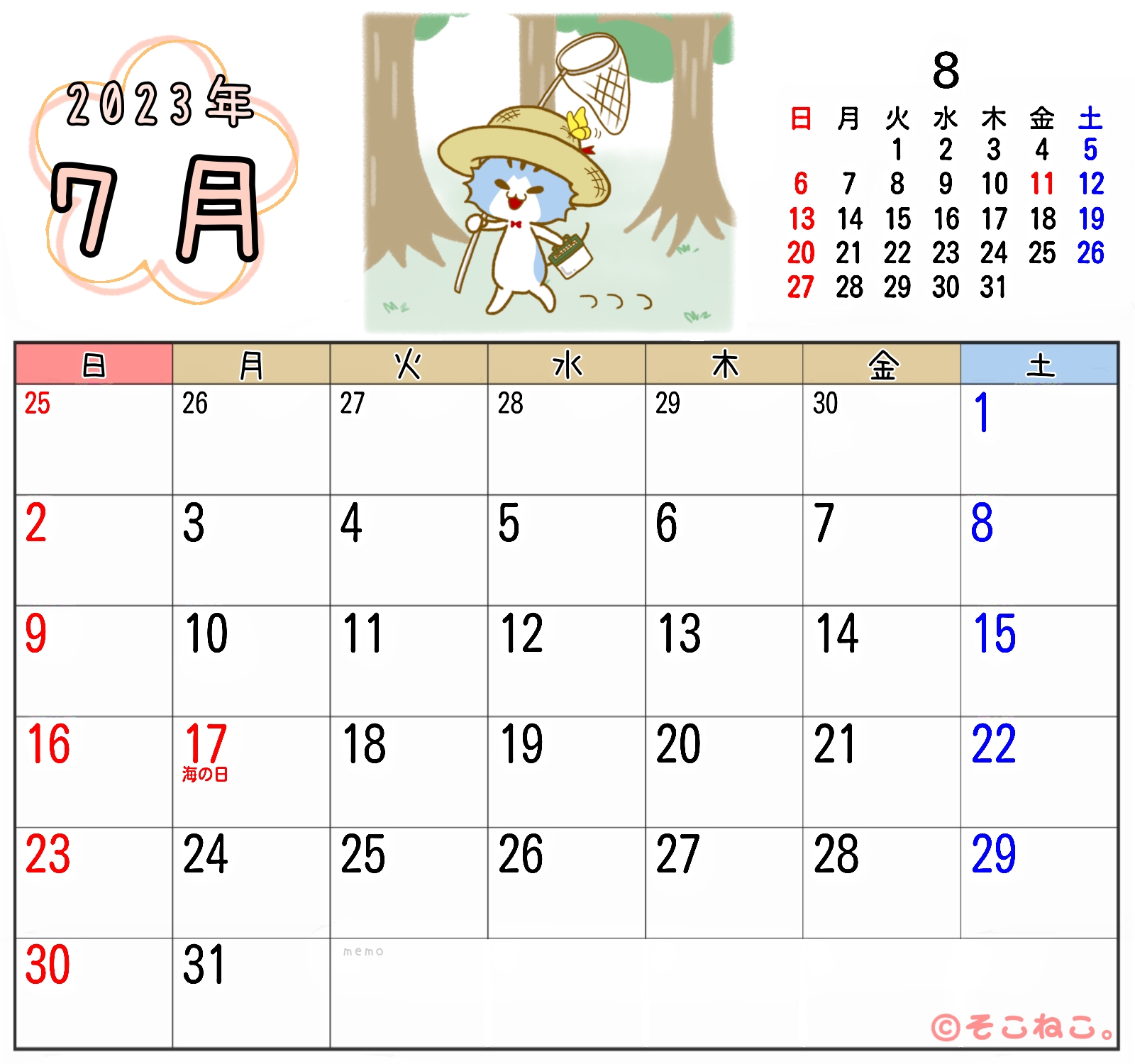 2023年7月カレンダーそこねこ。