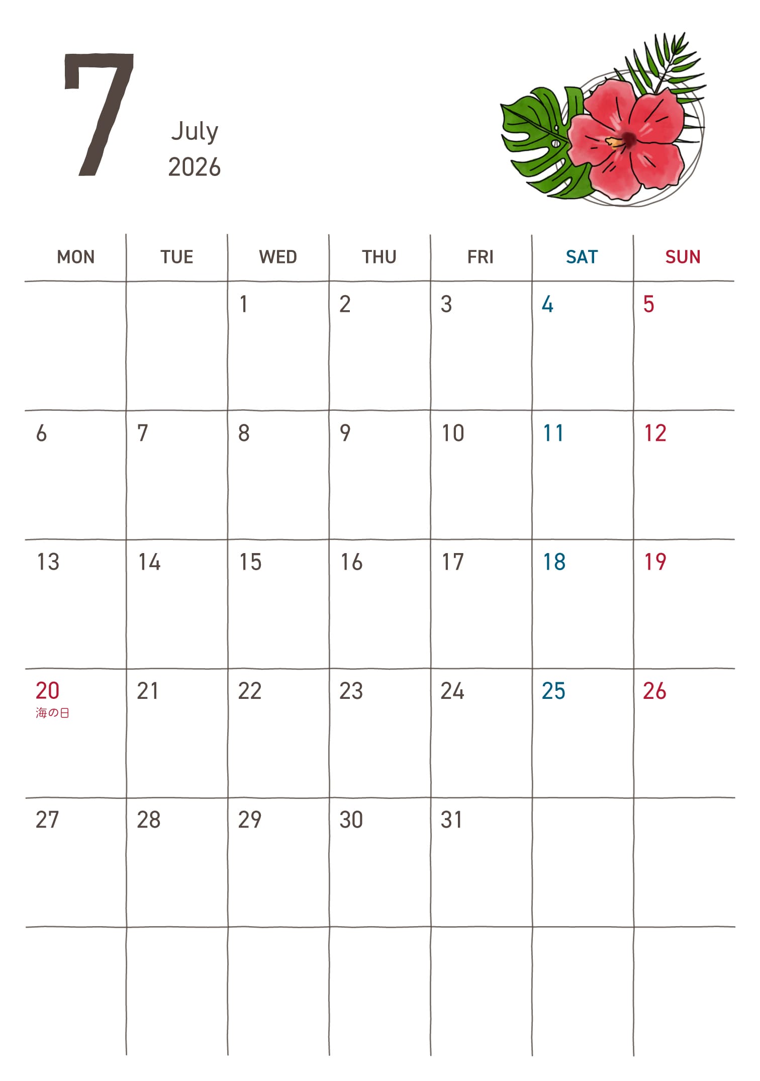 B6カレンダー2026年7月フリー素材 - GreenStock40。