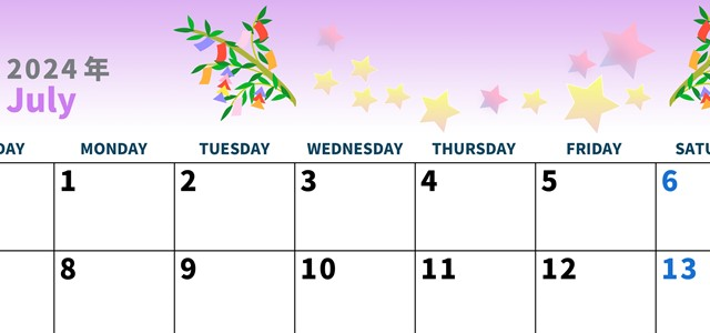 2024年7月横型の日曜始まり 七夕イラストのかわいいA4無料カレンダー素材デザイン王。