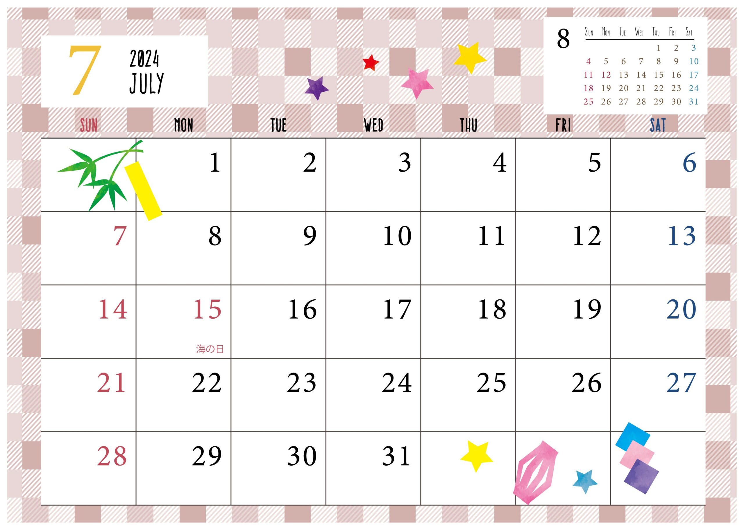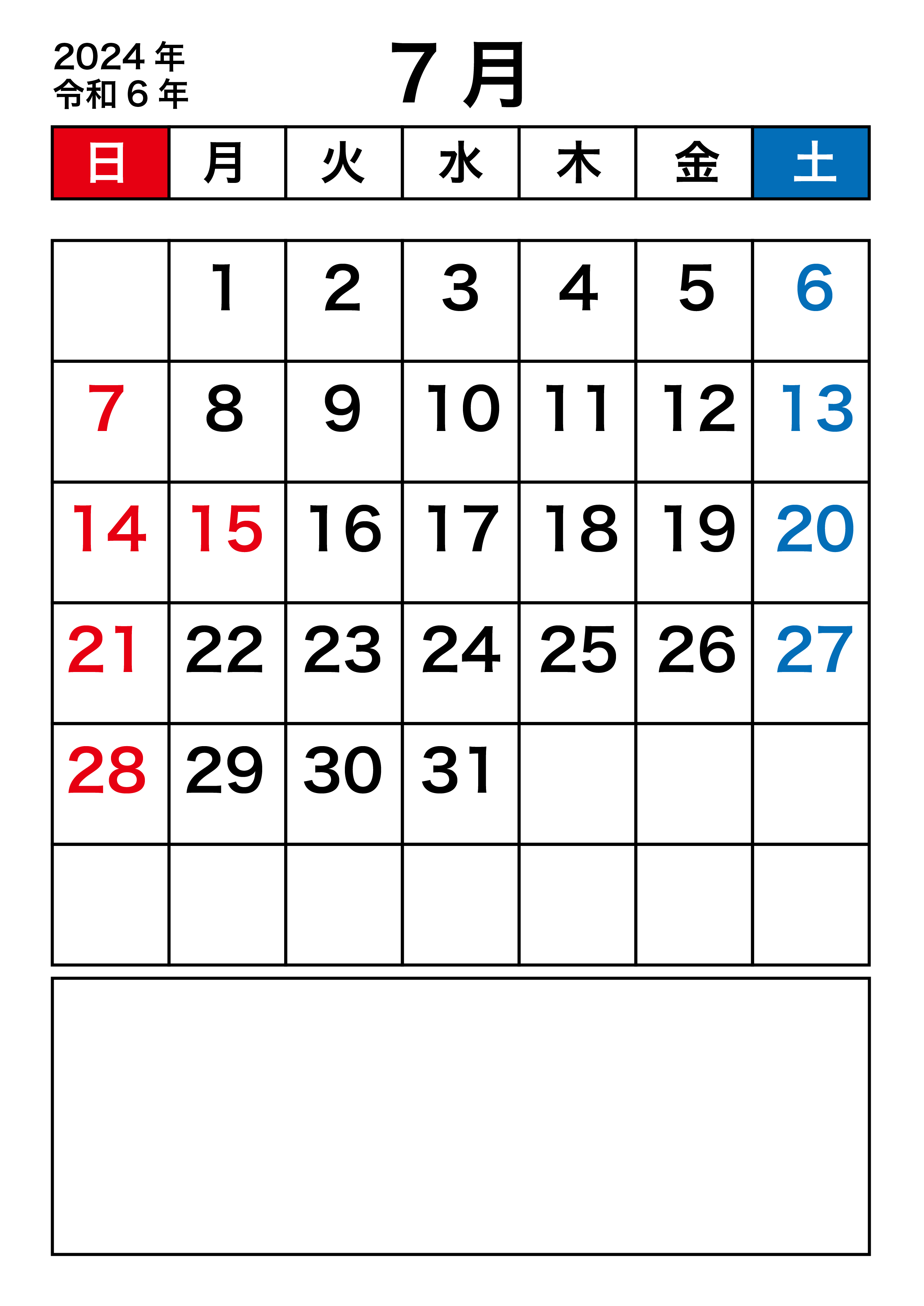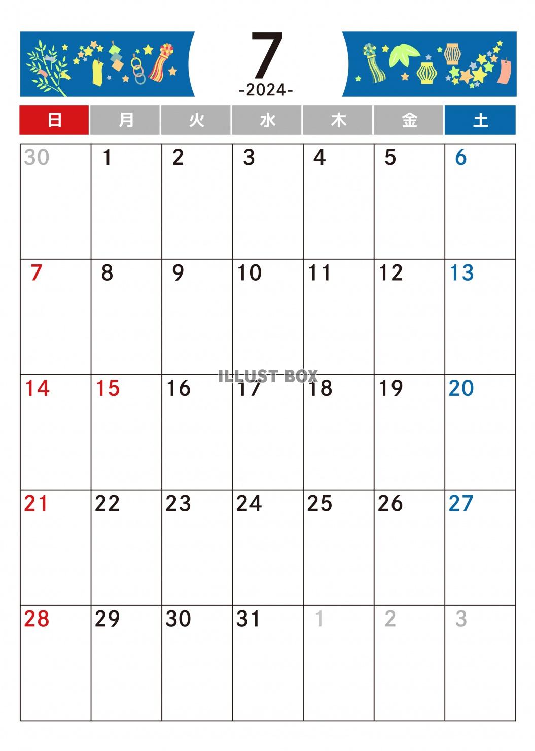 2024年7月カレンダーA4縦・フリー素材 PNG PDF形式。