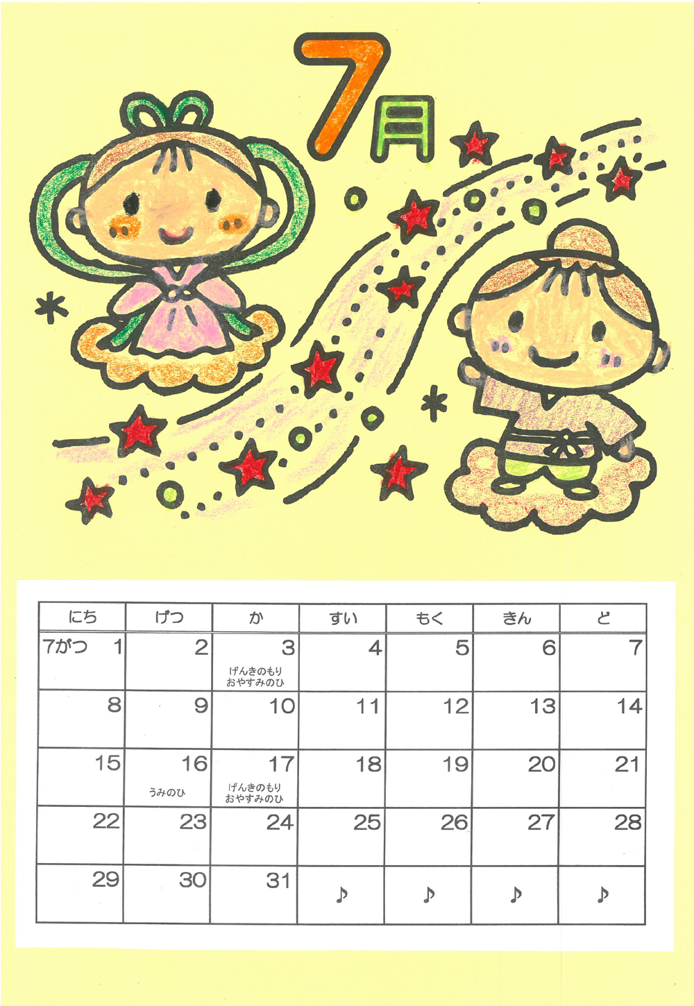 2021年令和3年 7月 無料で印刷できるPDFカレンダー シンプルだけどかわいい園だより、おたよりで使えるかわいいイラストの無料素材集 イラストだより。