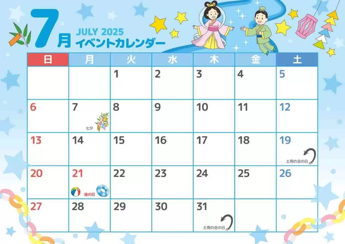 2025年7月イベントカレンダー お便り・フレーム フレーム・テンプレート の無料イラスト介護アンテナ。