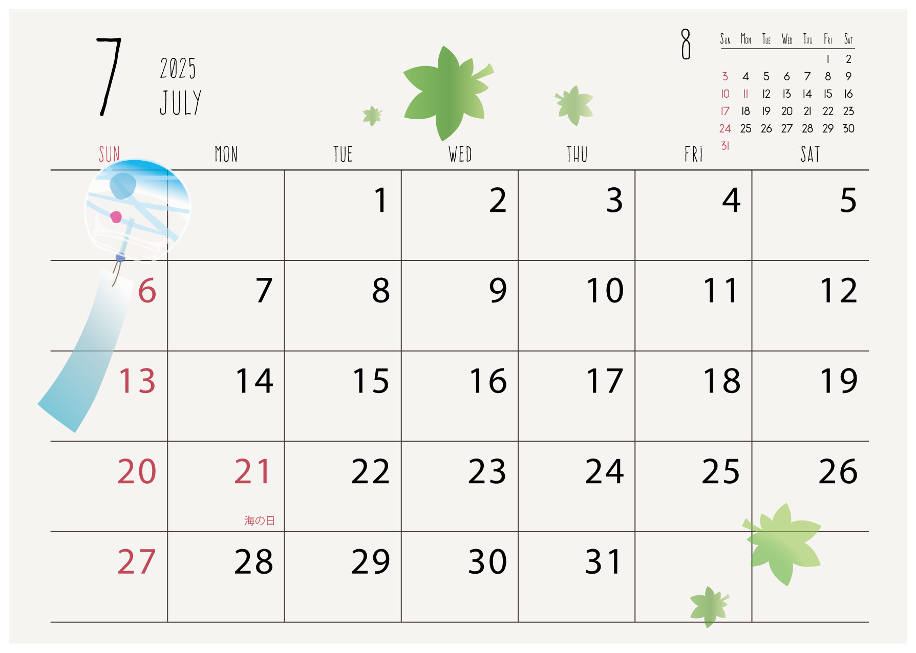 2025年・令和7年の月別カレンダー「7月」風鈴のかわいいイラスト入り・夏休みの予定表に イラストボックス「プレミアム」テンプレート。