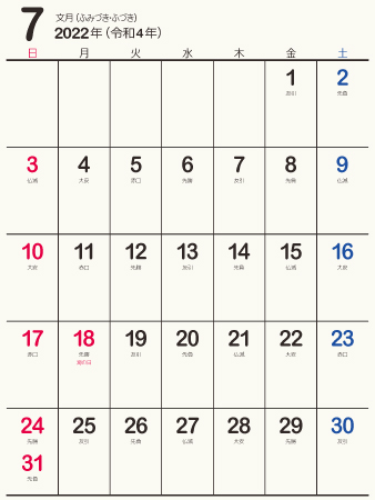 縦型六曜付き 2022年 7月 カレンダー無料イラスト素材素材ラボ。