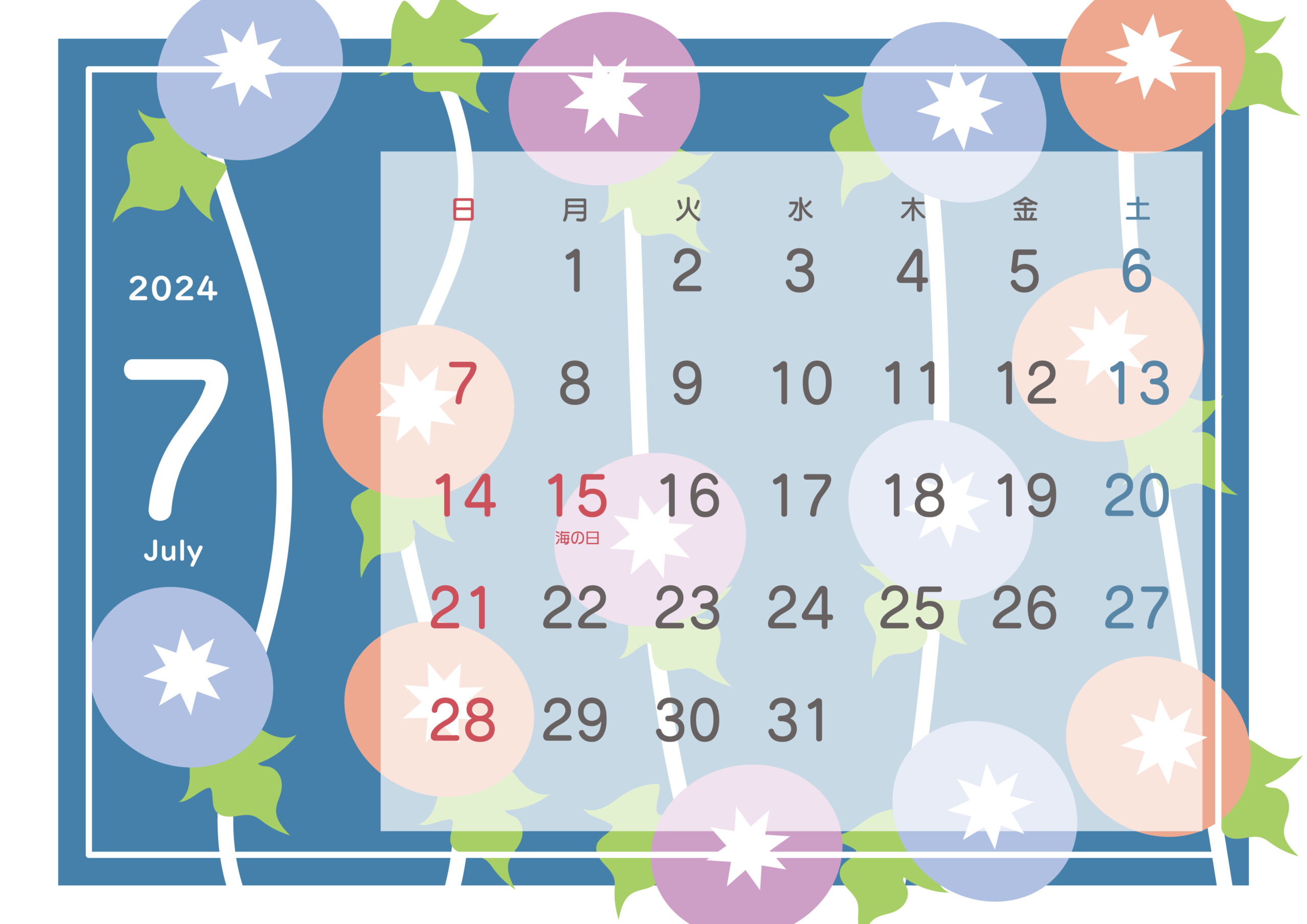 朝顔の花デザイン「2024年7月のマンスリーカレンダー」かわいい・おしゃれなテンプレート イラストボックス「プレミアム」テンプレート。